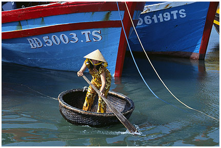 Frau in einer "Nussschale" im Hafen von Pan Thiet
